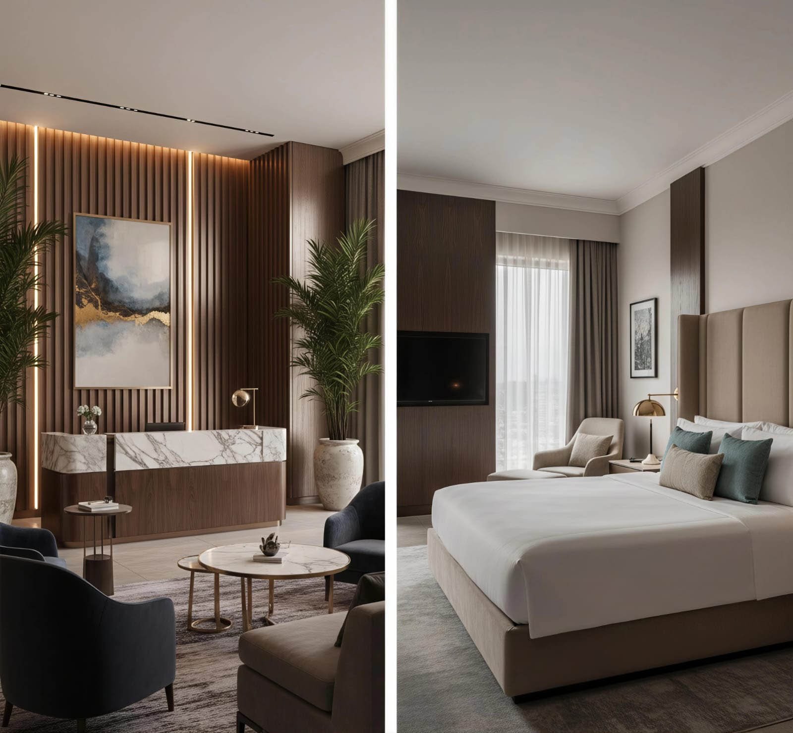نقدّم تجهيزات فندقية متكاملة تشمل الأثاث والفرش بمواد عالية الجودة، لنمنح منشأتك مظهراً راقياً وتجربة ضيافة مميزة ترضي ضيوفك.